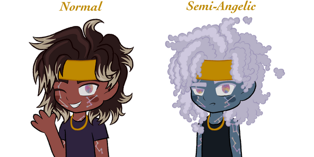 Celestial Hybrids, also called “Nephilim,” are exceedingly rare. Unlike their pureblood kin, they cannot take incorporeal form and instead inherit the guise of their mortal parent. Their heightened physicality causes them to grow larger and stronger than their lineage would normally allow. Their wings and voices remain underdeveloped, leaving them unable to walk the Honmoon or wield it with full Celestial finesse—though they can still manipulate it and open portals.Hybrids cannot conceal their unnatural eyes, and they possess little control over their semi-angelic guises. Reignited Nephilim, however, manifest fully developed wings and voices.