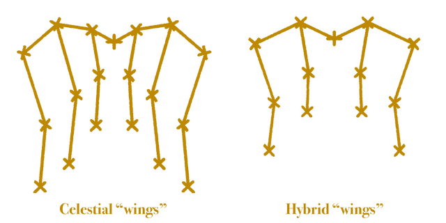 Despite their variety of guises, Celestials always share certain traits. Their skin is bluish, ranging from pale sky to deep midnight, & marked with golden constellations. The patterns on their backs always resemble wings, which allow them to walk upon the Honmoon and pierce space itself. Their irises are made of a solid, glossy substance—gemstones, metals, stained glass, or stranger materials.