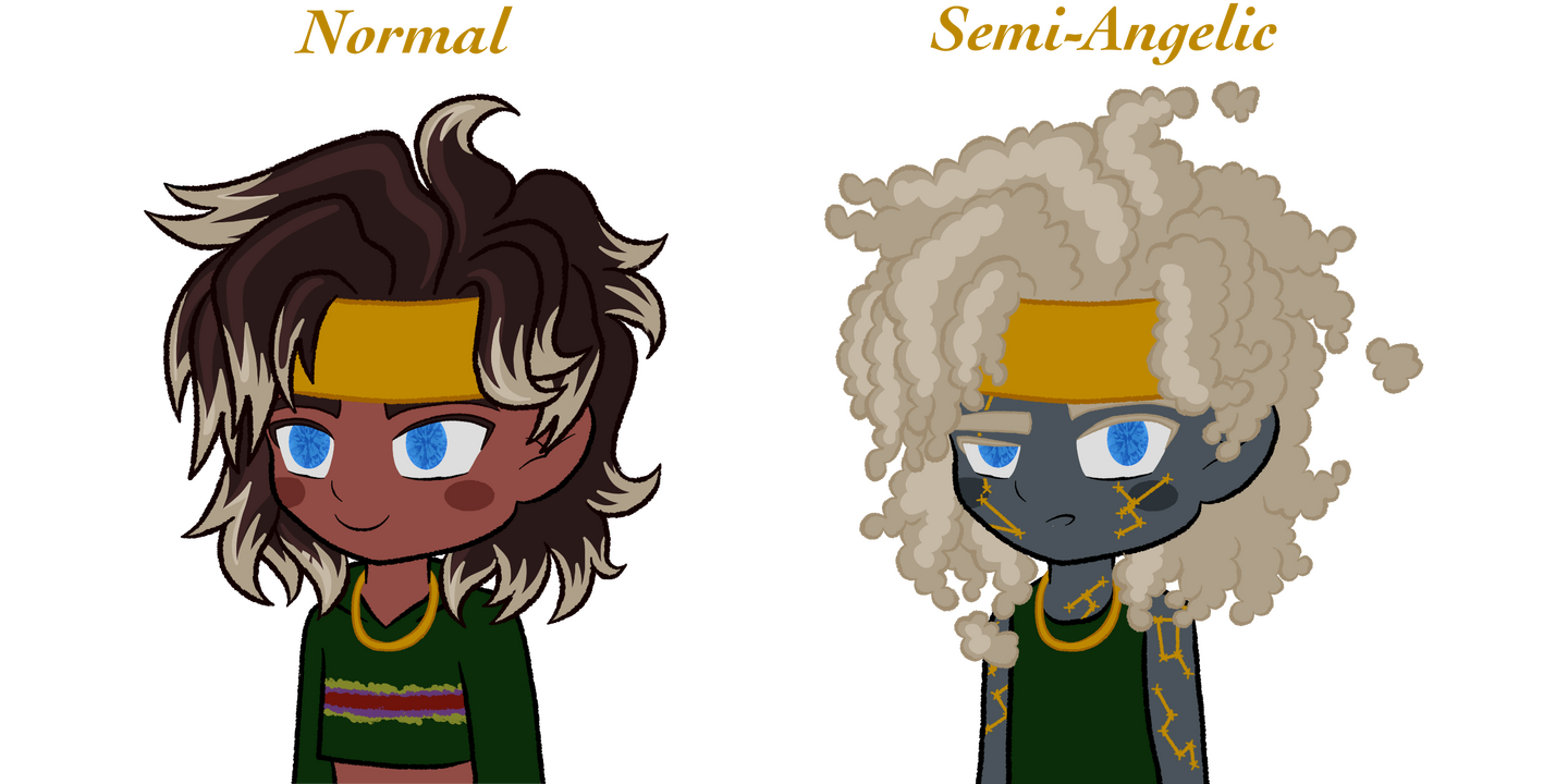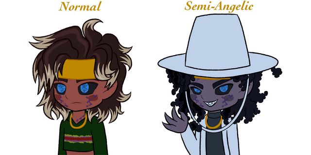 Celestial Hybrids, also called “Nephilim,” are exceedingly rare. Unlike their pureblood kin, they cannot take incorporeal form and instead inherit the guise of their mortal parent. Their heightened physicality causes them to grow larger and stronger than their lineage would normally allow. Their wings and voices remain underdeveloped, leaving them unable to walk the Honmoon or wield it with full Celestial finesse—though they can still manipulate it and open portals.Hybrids cannot conceal their unnatural eyes, and they possess little control over their semi-angelic guises. Reignited Nephilim, however, manifest fully developed wings and voices.